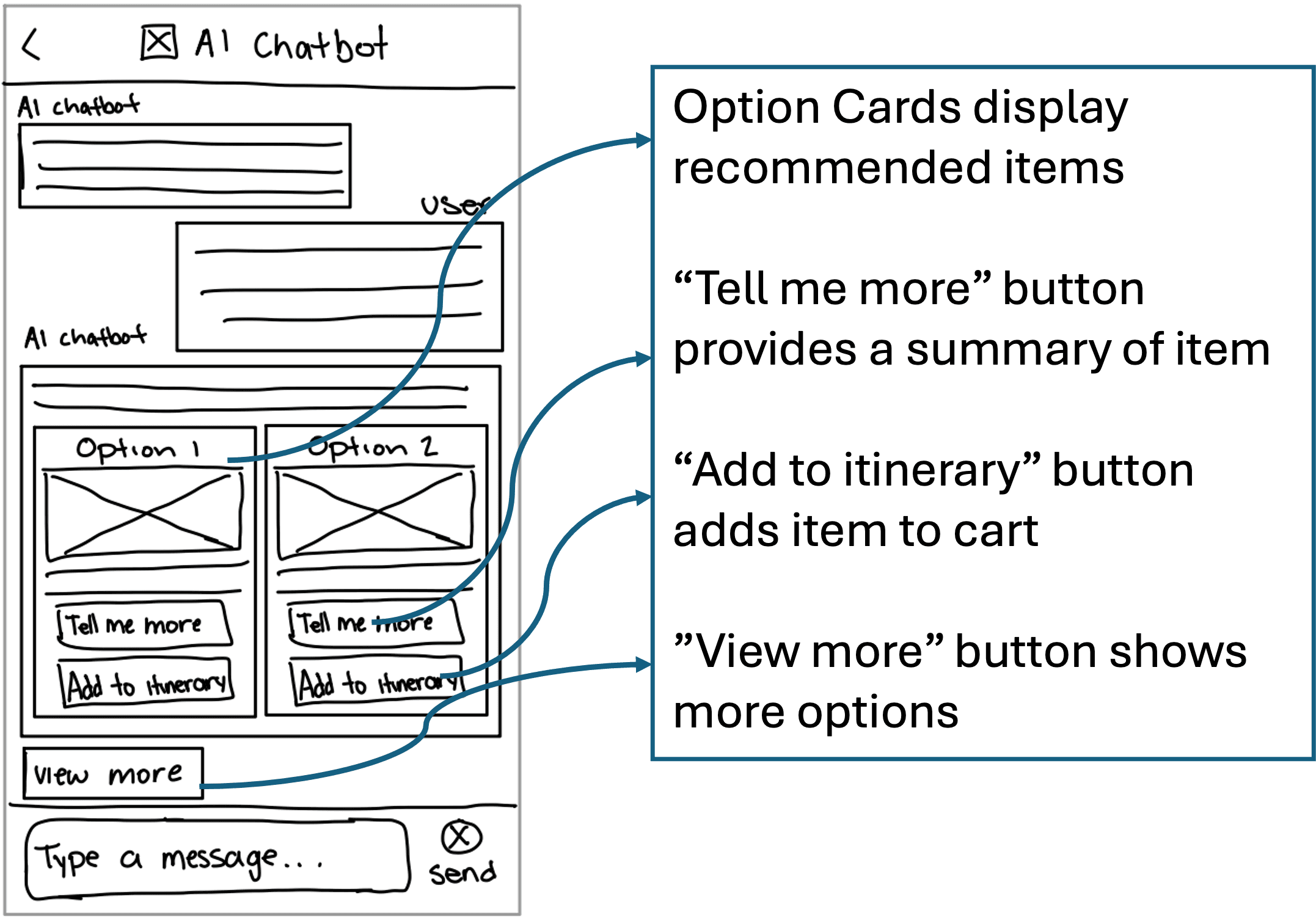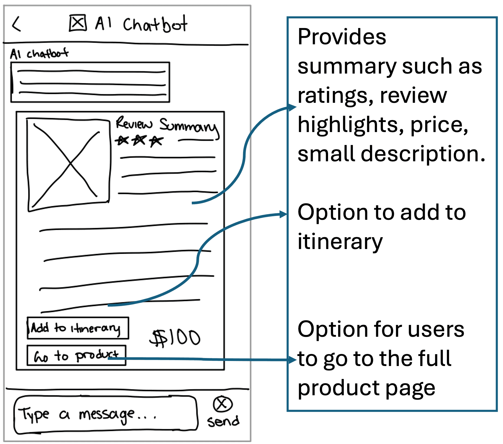 The usability testing showed that majority of the chatbot’s design is easy to use and does not cause any high priority problems. Other than some cosmetic issues, the feedback received by follow up questions provided reassurance that this structure is helpful for the users and is also on track to help them achieve their overall goal of planning and booking complete tailored travel itineraries in a less overwhelming and more time efficient way.