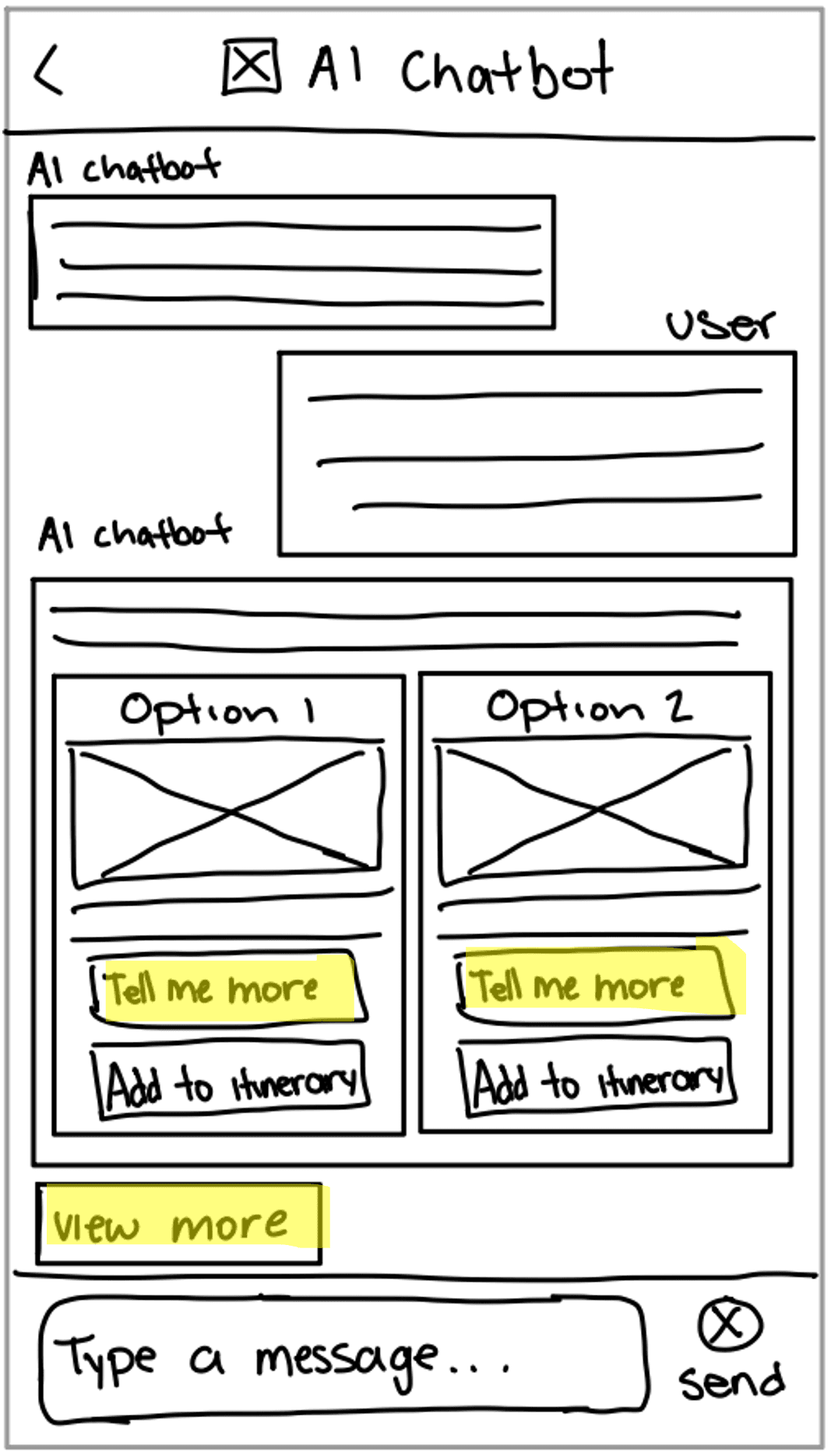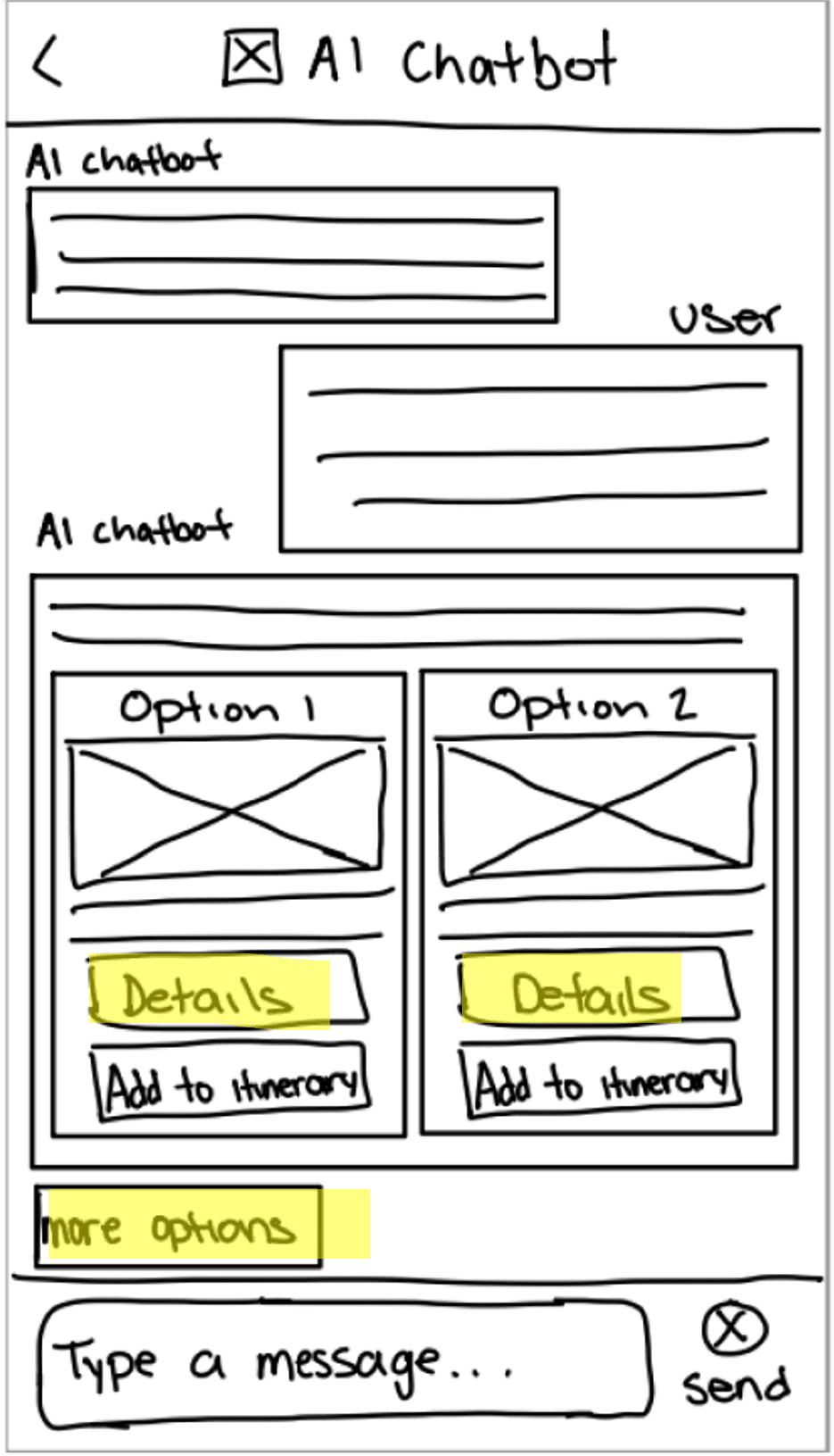 Conducting usability testing on the wireframe sketches was a bit tough as the participants were mistaking text bubbles for buttons – which I don’t believe would have been the case with a higher-fidelity prototype. Overall, caused some discrepancies between what were meant to be functionalities and what were only meant for displaying information.