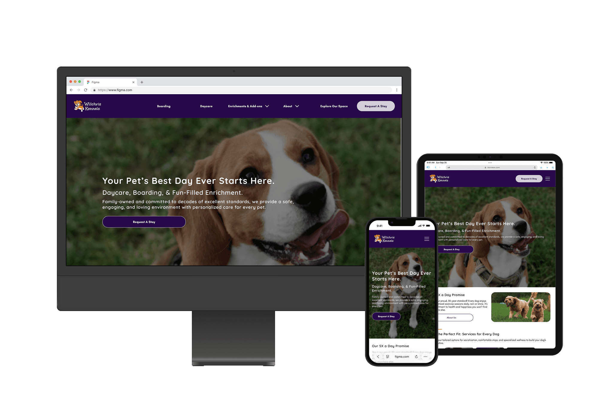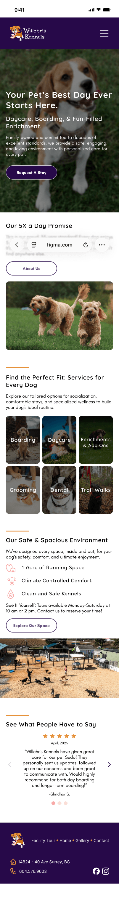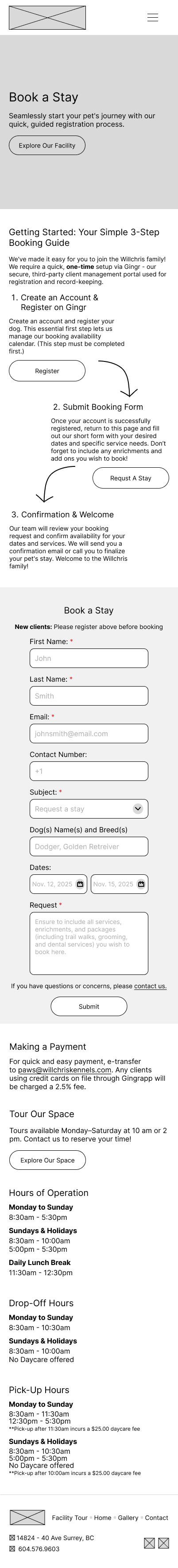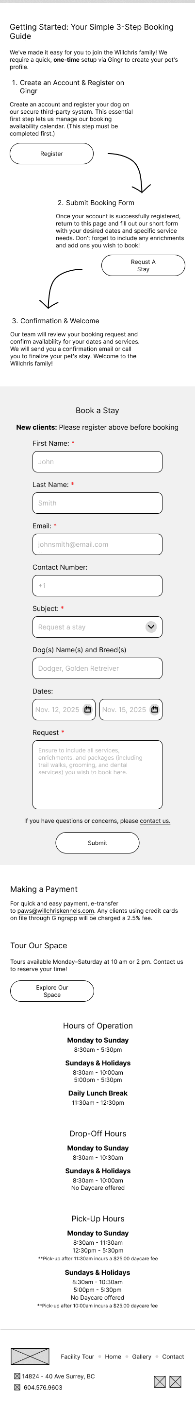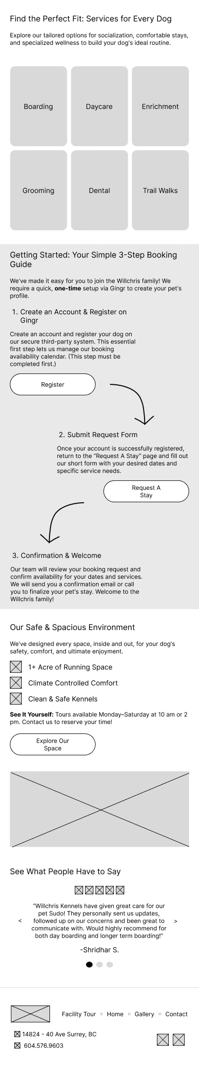I brought the Willchris redesign to life through an interactive prototype. This final design reflects the full experience: from learning about the kennel and services offered to building trust with new customers and an intuitive registration process.