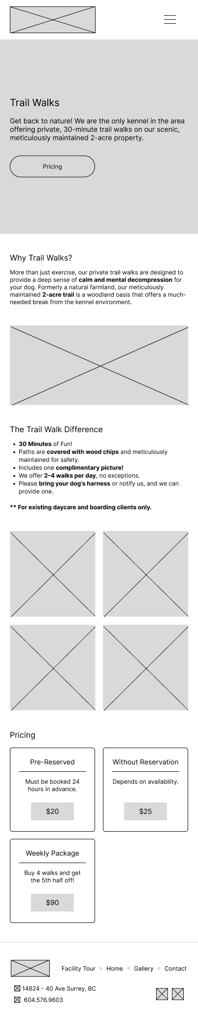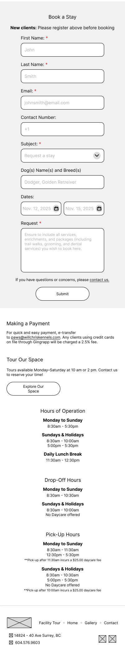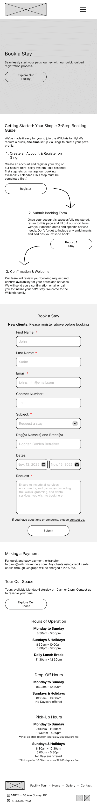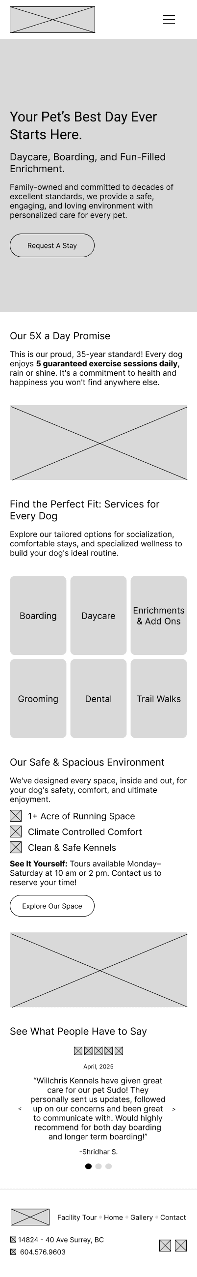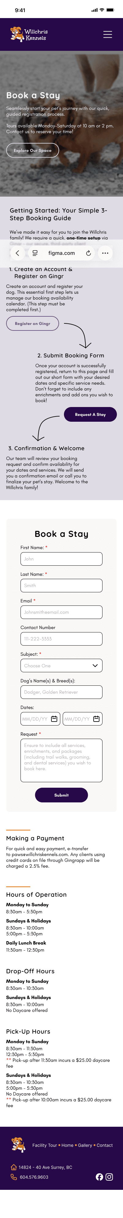 I brought the Willchris redesign to life through an interactive prototype. This final design reflects the full experience: from learning about the kennel and services offered to building trust with new customers and an intuitive registration process.
