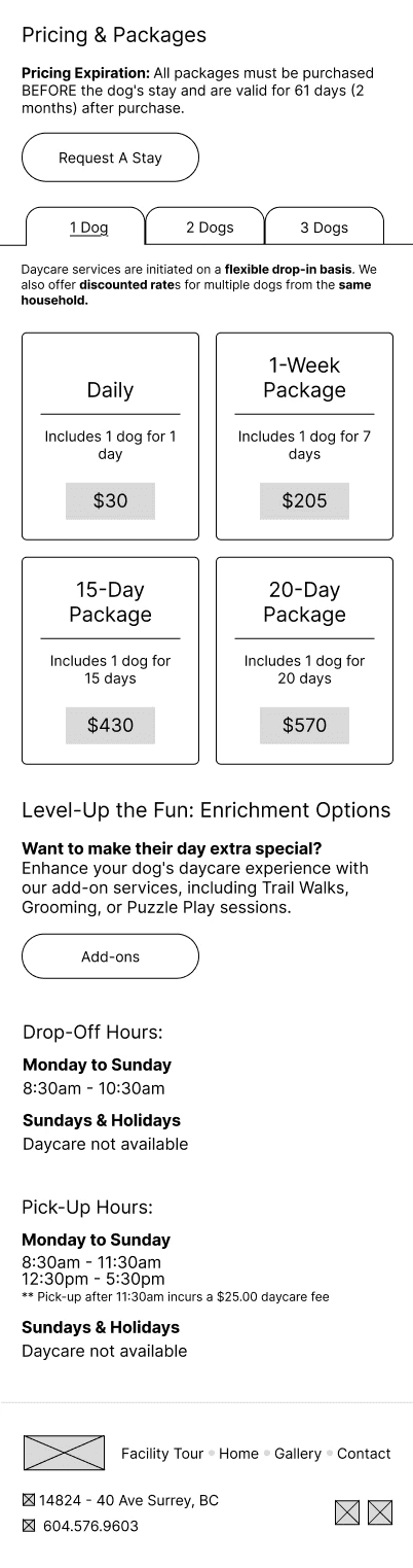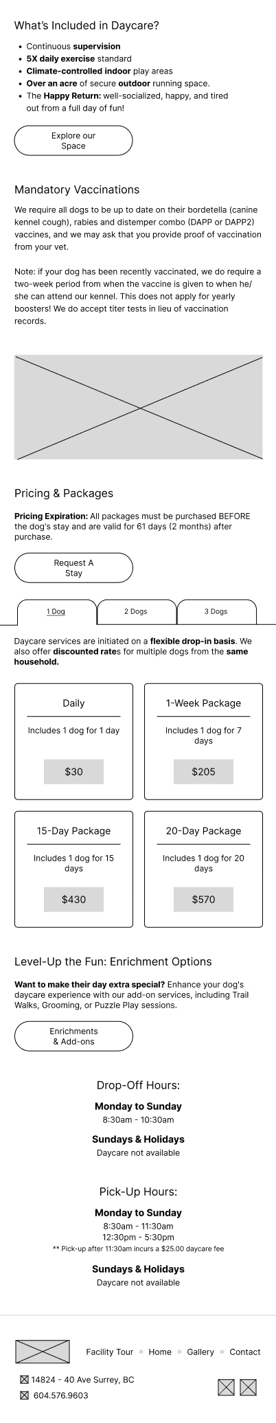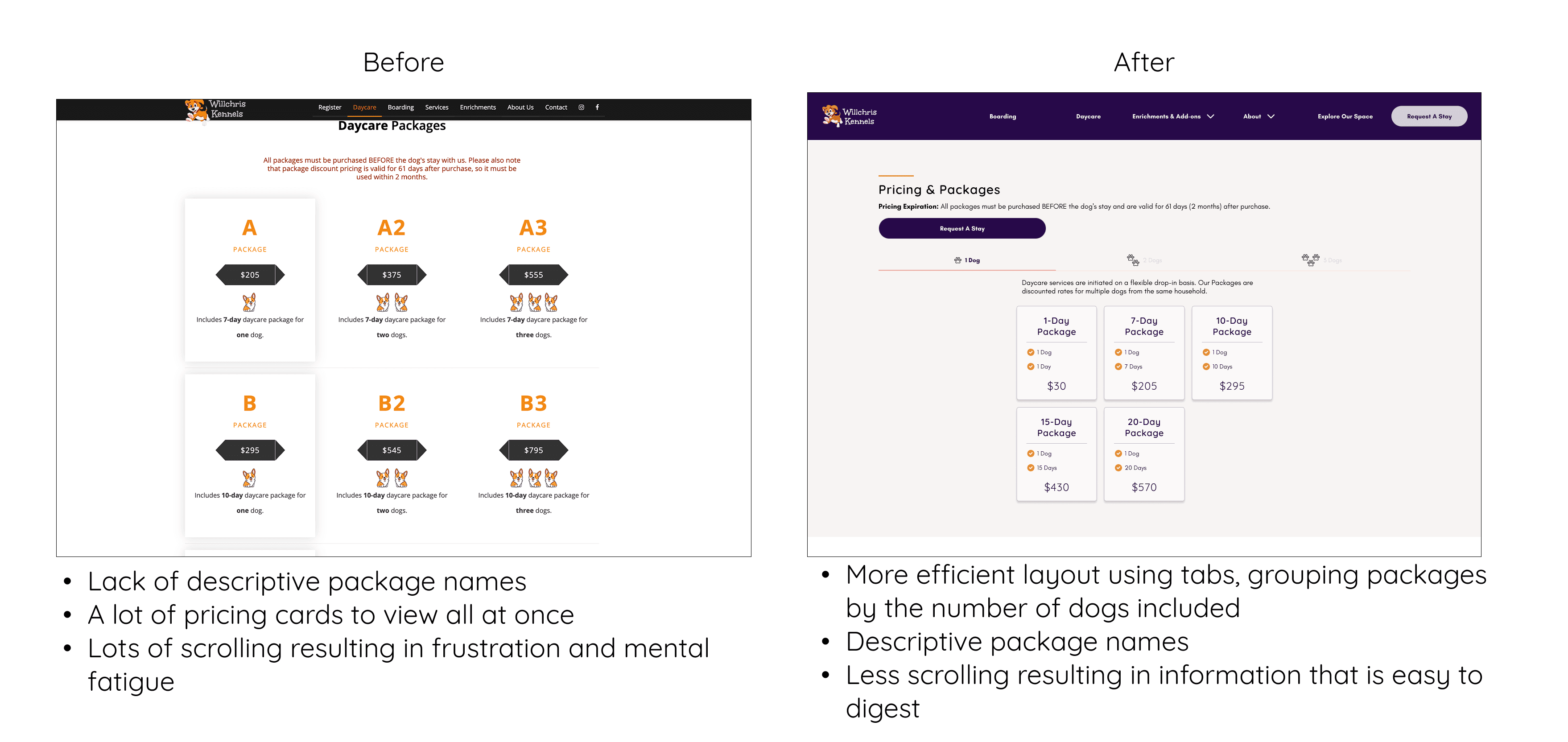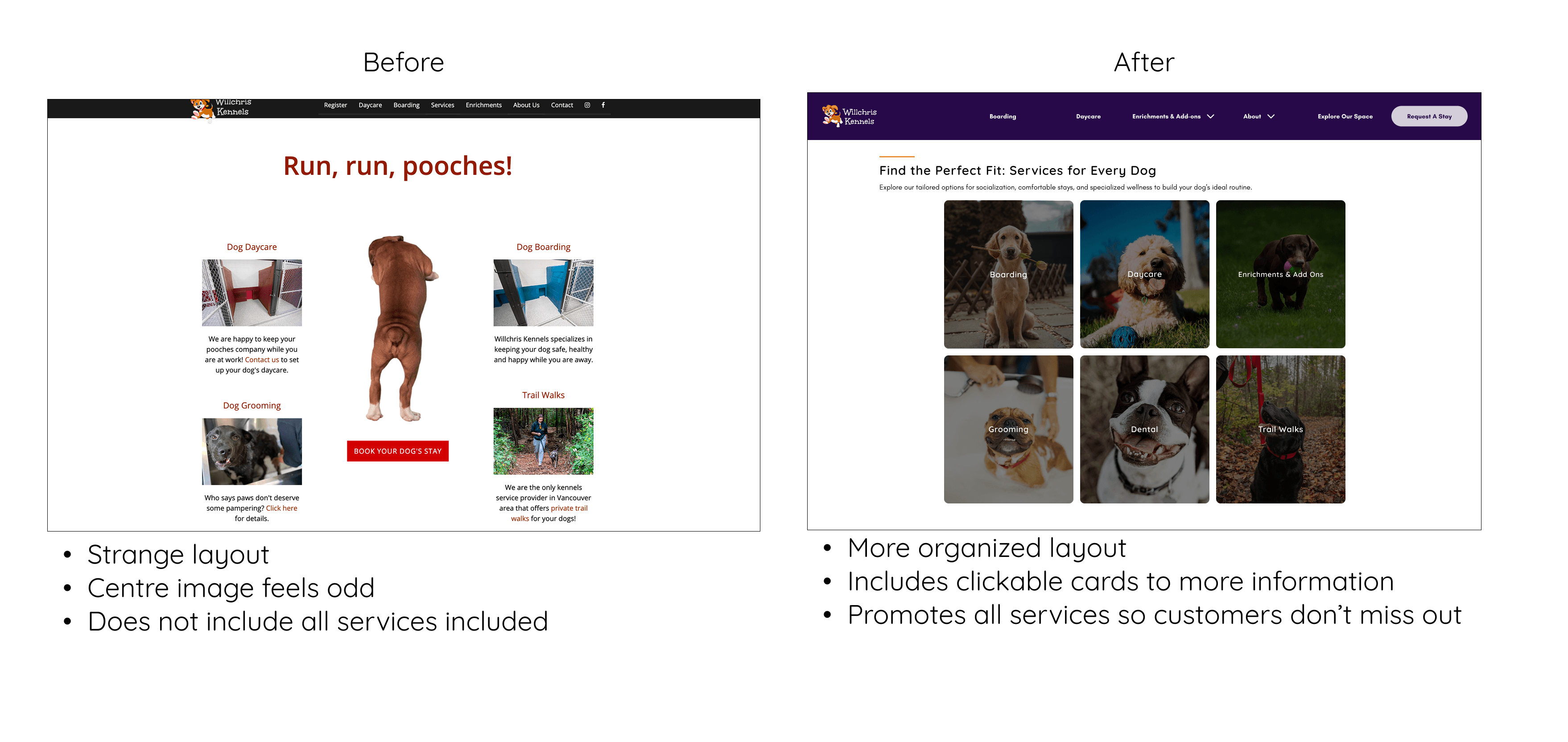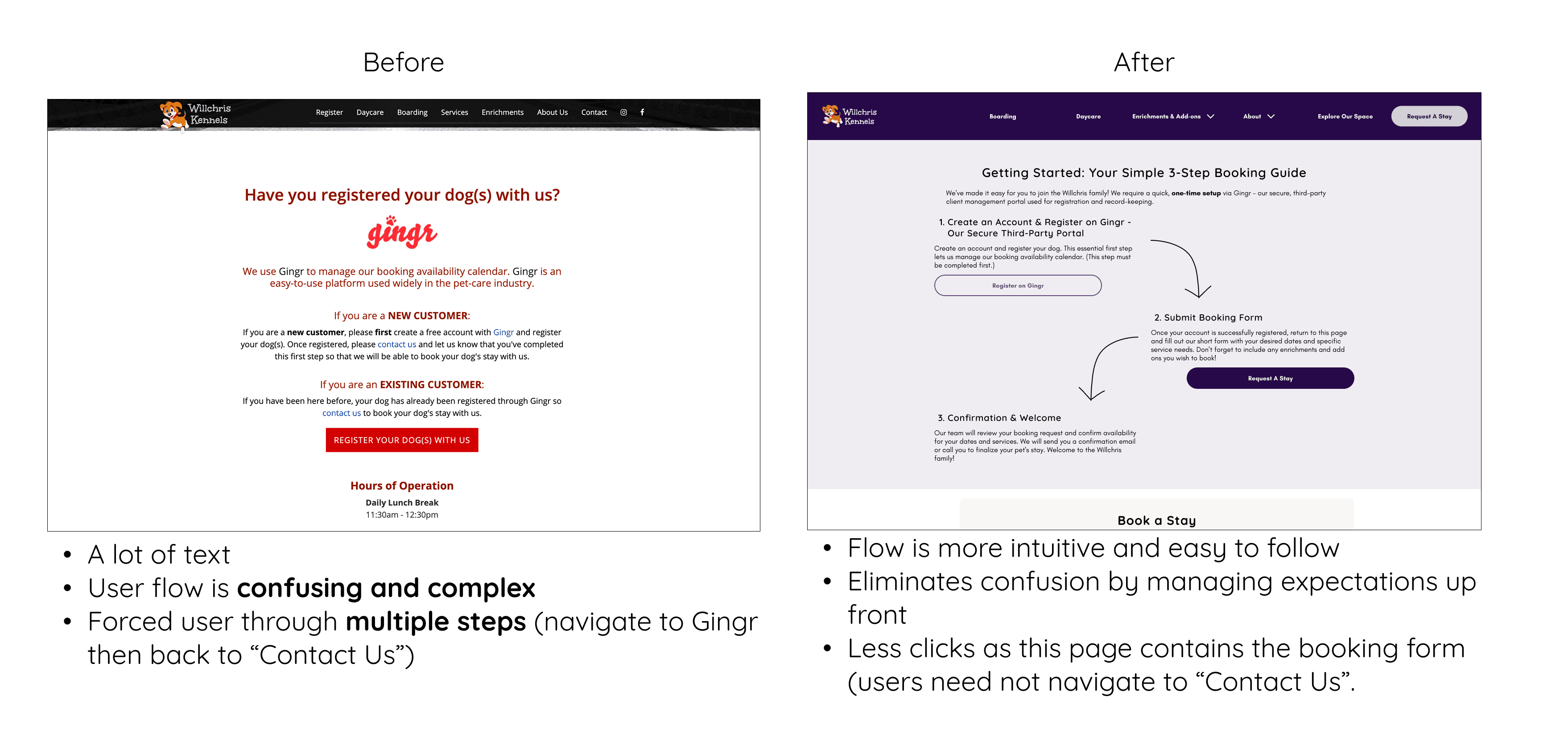 The Fix: Based on user feedback, I inverted the homepage hierarchy to better align with user's goal of understanding the kennel and what we offer before being shown booking instructions.