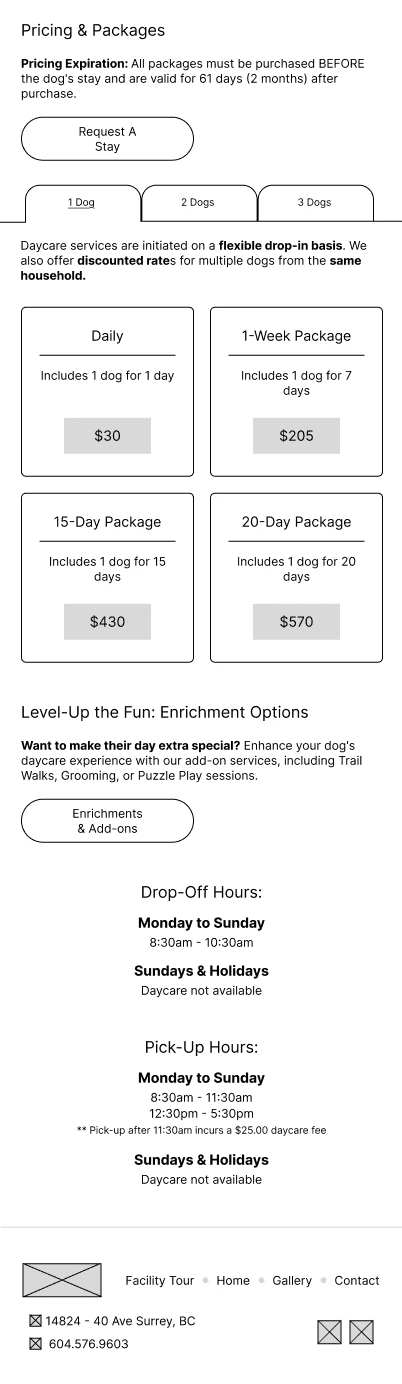 The original site suffered from extreme information overload. Critical service details were buried in "walls of text," causing high cognitive load. Combined with a confusing third-party booking requirement ("Gingr") and an "industrial" color palette, users felt lost, anxious, and overwhelmed.