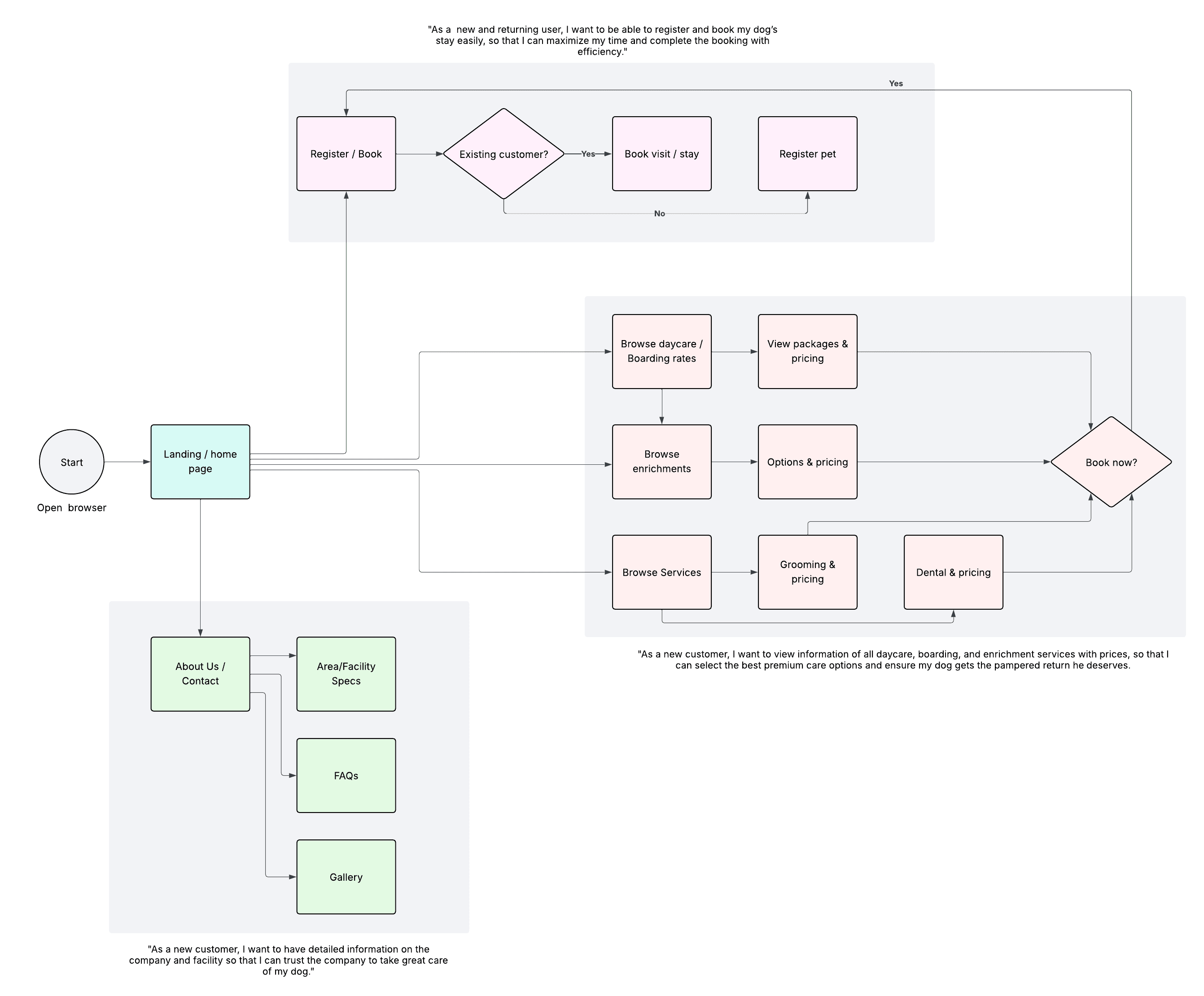 I mapped out three key user stories reflecting common scenarios for new and returning customers. These helped define how users navigate the site and identify the screens, decisions, and actions involved in completing core tasks.